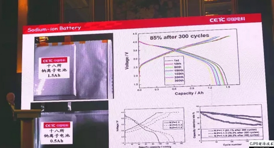 我們做了1.5Ah和0.5Ah兩種軟包全電池,正極材料采用前面提到的鎳錳氧化物,負(fù)極采用生物質(zhì)的硬碳材料,經(jīng)300次循環(huán)后容量衰降為15%。由此可見,鈉離子電池用廉價材料是可以制備的,而且電性能良好。