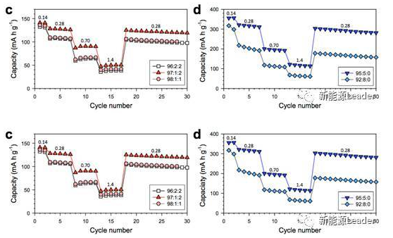 該固體電解質(zhì)的倍率性能測試如下圖所示,從結(jié)果來看,降低PVDF粘結(jié)劑的含量,可以有效的提升電池的倍率性能,這主要是因為較低的PVDF粘結(jié)劑含量,有助于提升固體電解質(zhì)與活性物質(zhì)之間的離子電導率,從而改善電池的倍率性能。但是降低導電劑SP的含量卻會導致倍率性能下降,這可能是因為電極的電子導電性下降導致的。