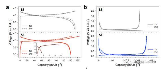 Dong Hyeon Kim將上述制備的正負極電極分別制成半電池進行電化學測試,測試結(jié)果如下圖所示,從結(jié)果上我們看到,對于正極LCO材料,采用固體電解質(zhì)的實驗電池比容量為141mAh/g,而采用液體電解質(zhì)的對照組比容量為154mAh/g,而對于負極石墨,采用固體電解質(zhì)的實驗電池的比容量為364mAh/g,采用液體電解質(zhì)的對照組僅為312mAh/g,但是固態(tài)電解質(zhì)電池的首效都較低(正極76.6%,負極80.7%),這與硫化物固體電解質(zhì)在高電壓和低電壓下不穩(wěn)定有關(guān),首次充電的過程中,部分Li+不可逆的嵌入到固體電解質(zhì)中,但是隨后形成的惰性分解產(chǎn)物能夠?qū)腆w電解質(zhì)祈禱保護作用,防止其進一步分解。