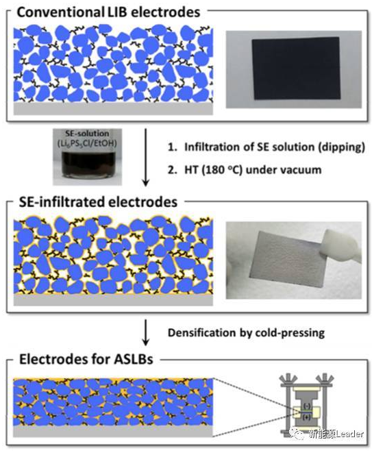 實驗過程如下圖所示,首先利用了傳統(tǒng)的生產(chǎn)工藝獲得正負極電極,然后將Li2S、P2S5和LiCl利用球磨混合均勻,然后將混合均勻的粉末溶解在乙醇之中,形成均一的溶液,再利用最開始涂布的電極吸收固體電解質(zhì)溶液,然后在真空環(huán)境下進行干燥,除去溶劑,隨后在真空環(huán)境,180℃下進行熱處理,最后采用冷軋機在770MPa的壓力下對上述電極進行碾壓,降低電極的空隙率,提高離子電導率。