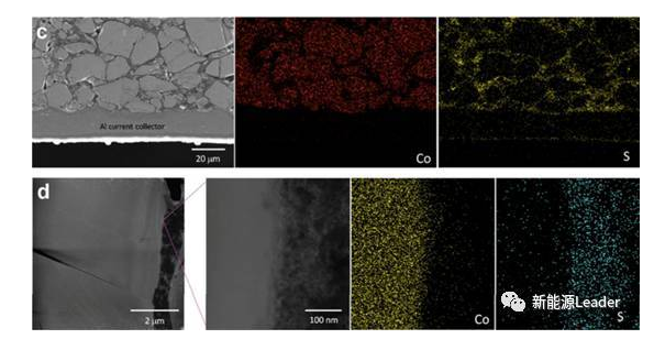對上述制備的極片采用場發(fā)射顯微鏡SESEM和X射線能譜EDXS觀察元素分布,結(jié)果如下圖所示,可以看到,固體電解質(zhì)很好的占據(jù)了活性物質(zhì)顆粒之間的空間。
