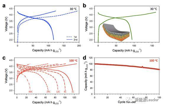 完成了上述測試后Dong Hyeon Kim還進行了全電池測試,正負極分別采用上述濕混工藝制備的固體電解質(zhì)電極,隔膜采用了新型的柔性固體電解質(zhì)-無紡布隔膜,厚度僅為70um,0.5C循環(huán)后容量保持率為95.9%。電池在100℃下6C循環(huán)100次容量保持率大道82%,這一溫度遠遠超過了傳統(tǒng)的鋰離子電池的正常工作溫度。