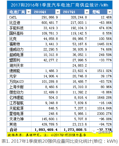 從兩個(gè)年份1季度的汽車電池裝機(jī)總量中各電池廠商的供應(yīng)情況看,20強(qiáng)的入榜標(biāo)準(zhǔn)恰巧下降了一半:2016年1季度前20強(qiáng)的供應(yīng)量都在1萬(wàn)kWh以上,而2017年1季度下降到0.5萬(wàn)kWh以上。表1是以2017年1季度的前20強(qiáng)為基準(zhǔn),看一下各電池廠商的供應(yīng)變化: