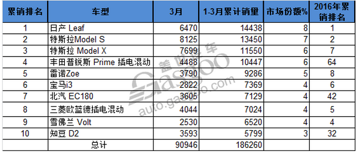 盡管特斯拉的攻勢(shì)較為強(qiáng)勁,Model S和Model X雙雙入圍前十排名,然而日產(chǎn)Leaf在累計(jì)銷量排名當(dāng)中的表現(xiàn)也十分搶眼,累計(jì)售出14,438輛,排在第一位;而單三月份,其共計(jì)售出6,470輛,創(chuàng)近12個(gè)月以來(lái)最好成績(jī)。