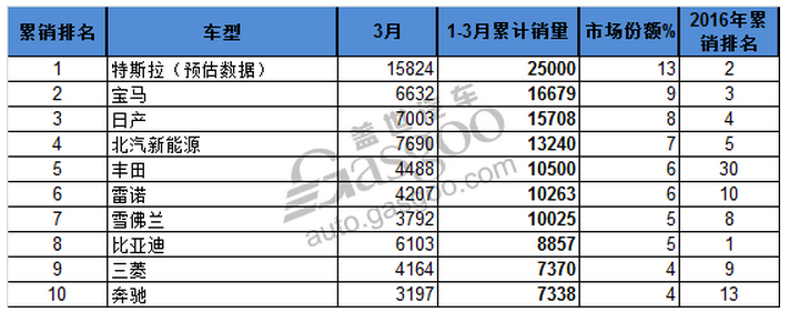 特斯拉3月份全面爆發(fā),前三個(gè)月共計(jì)交付2.5萬(wàn)輛,成功篡奪了寶馬第一的位置,而寶馬品牌前三個(gè)月共計(jì)售出16,679輛,排在第二位。緊隨其后的是日產(chǎn),前三個(gè)月累計(jì)售出15,708輛,其中僅3月份就已售出7,003輛。北汽新能源的累計(jì)銷量排名上升至第四位,累計(jì)售出13,240輛,其中3月份也歷史性的達(dá)到7,690輛。而縱觀前四的排名,基本上與去年無(wú)異,但去年的銷量冠軍比亞迪前三個(gè)月的累計(jì)銷量?jī)H為8,857輛,排在第8位。