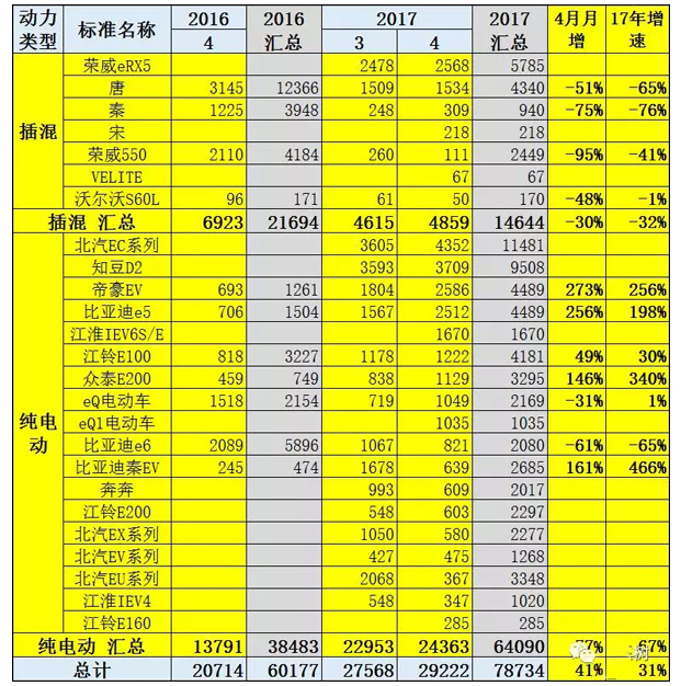 就單個(gè)車型看,純電動(dòng)領(lǐng)域,北汽EC系列、知豆D2、帝豪EV分別以4352輛、3709輛和2586輛的成績(jī)位列暢銷車型前三,這已經(jīng)是北汽EC系列連續(xù)3個(gè)月獲得銷量第一名。插電混動(dòng)領(lǐng)域4月同比下滑較大,表現(xiàn)較好的是榮威ERX5,以2568輛位列榜首,比亞迪唐、秦分別以1534輛和309輛位列二三。