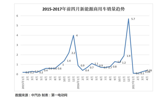 在新能源商用車方面,4月份的銷量為3883輛,環(huán)比3月份2330輛增長(zhǎng)47.6%,同比去年四月增長(zhǎng)-64.2%,前四月累計(jì)銷量同比去年增長(zhǎng)-71.6%。從2016年的銷量數(shù)據(jù)分布來看,12月新能源商用車的銷量的達(dá)到了5.7萬輛的高峰,許艷華,這里面可能存在提前消費(fèi)的現(xiàn)象,導(dǎo)致一季度商用車銷量走低。從未來新能源商用車增長(zhǎng)趨勢(shì)上看,未來電動(dòng)物流車可能會(huì)有較好的市場(chǎng)發(fā)展空間,為新能源商用車總銷量做出貢獻(xiàn)。