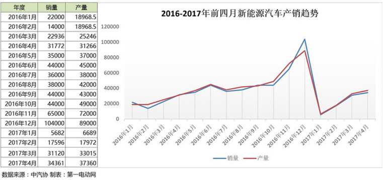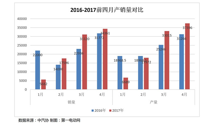 4月份,新能源汽車整體的產(chǎn)銷量分別為37360輛和34361輛,銷量同比去年4月31772輛增長(zhǎng)7.9%,環(huán)比今年3月33015輛增長(zhǎng)10.2%,前四月累計(jì)同比增長(zhǎng)-0.2%,即將進(jìn)入同比正增長(zhǎng)。從2017年前四月新能源汽車產(chǎn)銷量增長(zhǎng)趨勢(shì)來看,穩(wěn)重有進(jìn),增速放緩。對(duì)于這樣的增長(zhǎng)趨勢(shì),中國(guó)汽車工業(yè)協(xié)會(huì)副秘書長(zhǎng)許艷華表示,較緩慢的增長(zhǎng)可能會(huì)持續(xù)到6月份,6月以后可能會(huì)出現(xiàn)快速增長(zhǎng)的趨勢(shì),全年80萬新能源汽車推廣目標(biāo)有信心實(shí)現(xiàn),較符合預(yù)期。