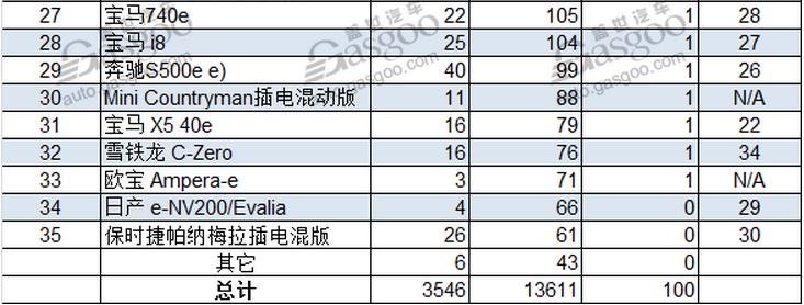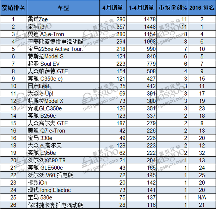 奧迪A3 e-Tron與歐藍德插電混動版的排名進行了對換,奧迪A3 e-Tron則憑借1,154的累計銷量排在第三位。大眾帕薩特GTE的累計銷量排名上升一位至第八位,而姊妹品牌高爾夫的銷量因插電混合版高爾夫GTE的推出,累計銷量排名上升至第15位,上個月共計售出187輛,創(chuàng)下近21個月以來最好成績;純電動版高爾夫的累計銷量排名上升至第18位,四月份共計售出128輛,為近八個月以來最好成績。作為電動汽車市場的老兵沃爾沃V60插電混動版前4個月的累計銷量排名攀升5位,排在第22位,4月份共計售出72輛。奔馳旗下的三款車型都有著非常好的表現,包括B250e, GLC350e and S500e。