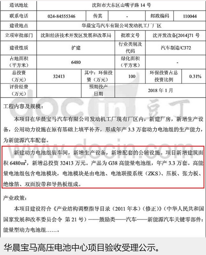 根據(jù)公示內(nèi)容的消息來(lái)看,華動(dòng)力電池組裝車間在華晨寶馬有限公司發(fā)動(dòng)機(jī)工廠現(xiàn)有的產(chǎn)區(qū)內(nèi)進(jìn)行新建廠房,增加生產(chǎn)設(shè)備。全部項(xiàng)目占地6480平方米,總投資32413萬(wàn)元,主要用于生產(chǎn)G38(即全新一代寶馬5系)高能量電池組,年產(chǎn)能為3.3萬(wàn)套。