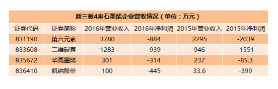 從2016年的營收情況來看,4家企業(yè)規(guī)模均不大。營業(yè)收入最多的第六元素也僅有3700余萬元,最小的凱納股份2016年營業(yè)收入僅有100余萬元。由于主營的石墨烯產(chǎn)品均未實現(xiàn)規(guī)?;a(chǎn)和銷售,4家公司業(yè)績?nèi)刻幱谔潛p狀態(tài)。