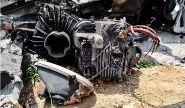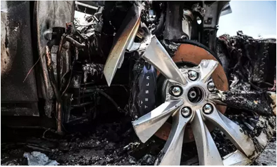 鋁合金鍛造的輪轂也被撞碎,同時又燒灼的痕跡。