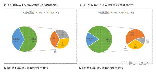 但通過對比2016年1-5月和2017年1-5月份的銷量結構可以看出,新能源乘用車中大量都是A00等級別的小型城市代步“占號車”。插電混動乘用車銷售比例在縮小,今年前5個月PHEV銷量占比由去年的36%下降到18%,由于產(chǎn)業(yè)布局不完善及我國插混發(fā)展較慢,主要一線城市均以純電動為主;純電動車型中A00車型的占比從去年的22%上升至45%,銷售比例顯著擴大。