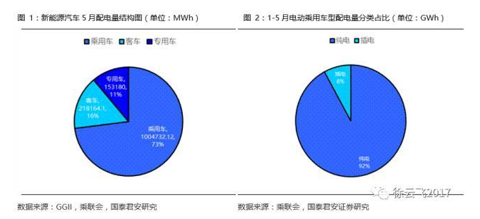 根據(jù)1-5月乘用車累計銷量(乘用車累計銷量11.68萬輛,平均配電量為25.79KWh),我們測算相對應的動力電池配電量共計3.01GWh,其中純電動乘用車配電量2.75GWh,占比高達92%,比上月累計增加2個百分點;插電式混動乘用車配電量為0.26GWh,占比僅為8%,比上月累計下降2個百分點。