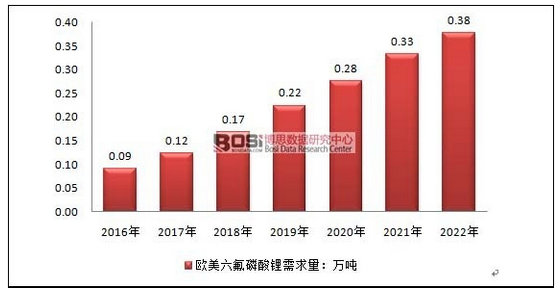 2016-2012年歐美六氟磷酸鋰需求量預(yù)測(cè)