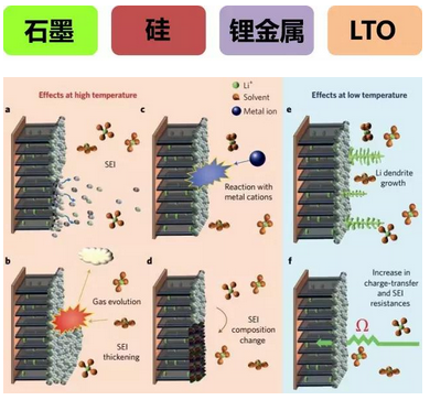負(fù)極材料的工作往往依賴于有效的異質(zhì)結(jié)構(gòu)鈍化層,溫度升高將使得鈍化結(jié)構(gòu)破壞,并引發(fā)副反應(yīng);而溫度降低又將降低鋰離子的透過性。
