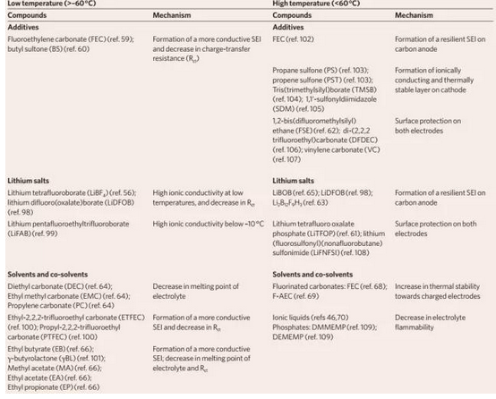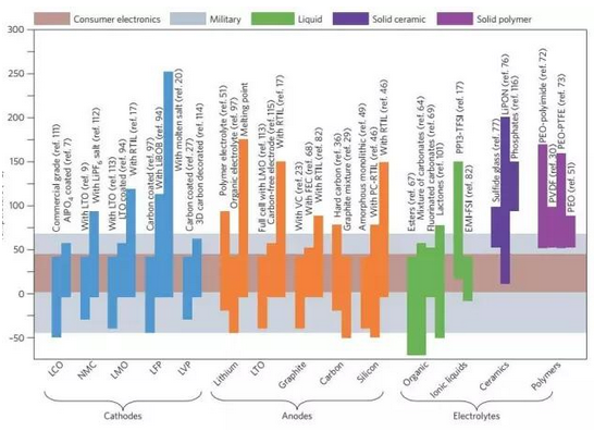 低溫條件下,電解質(zhì)粘度增加,阻礙離子遷移和電極潤濕性,降低比率性能;而且,導(dǎo)電性降低將引起電極周圍鋰離子的消耗。高溫條件下,電解質(zhì)容易發(fā)生化學(xué)變化,并和帶電的電極發(fā)生反應(yīng)。