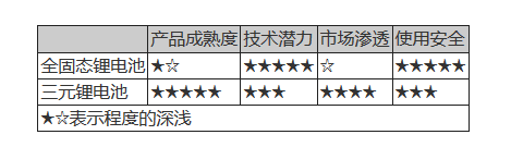 綜合上述產(chǎn)品、技術(shù)、安全等方面的比較,全固態(tài)鋰電池在使用安全和技術(shù)潛力方面具有絕對的優(yōu)勢,但是三元鋰電在產(chǎn)品成熟度、市場滲透方面具有相當(dāng)?shù)膬?yōu)勢。綜合來看,當(dāng)前采用三元鋰電是純電動(dòng)汽車最為明智的選擇。但是,一旦全固態(tài)鋰電池解決金屬鋰穩(wěn)定性差等問題后,將爆發(fā)強(qiáng)大的產(chǎn)品替代力,或?qū)㈩嵏矂?dòng)力電池產(chǎn)業(yè)格局。