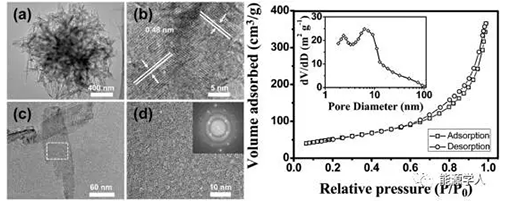 圖3.a) HLTO-NS微球的TEM圖,b) HLTO-NS微球的HRTEM圖,c)單獨(dú)納米片的TEM圖,d)單獨(dú)納米片的HRTEM圖,d)中FFT插圖,HLTO-NS樣品的N2脫吸附等溫線和孔徑分布曲線