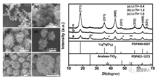 圖2.a)商業(yè)化的P25粒子的SEM圖,b)鈦酸鈉納米線的SEM圖,c)分層鈦酸鈉SEM圖,d)鈦酸氫鈉的SEM圖,e)和f)分層碳酸鋰的SEM圖,不同比例鈦酸鋰的XRD圖譜
