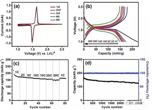 圖4.a) HLTO-NS的CV曲線,b) HLTO-NS在不同倍率下的初始充放電曲線,c) HLTO-NS的倍率性能,d) HLTO-NS在20C下經(jīng)過(guò)3000次循環(huán)的比容量和庫(kù)倫效率曲線