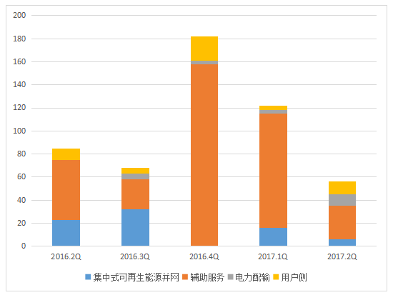 從應(yīng)用分布上看,全球新增投運項目中,輔助服務(wù)領(lǐng)域的裝機規(guī)模最大,為28MW,所占比重為56%,同比下降42%,環(huán)比2017年一季度下降72%。