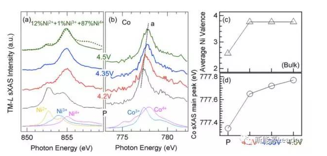 為了研究NMC材料在充電過(guò)程中電子結(jié)構(gòu)的變化,美國(guó)勞倫斯伯克利國(guó)家實(shí)驗(yàn)室的Ruimin Qiao等利用sXAS等手段對(duì)NMC532材料在高電壓下的電子結(jié)構(gòu)進(jìn)行了研究,發(fā)現(xiàn)在4.2V以下時(shí),Ni和Co共同發(fā)生氧化還原反應(yīng),提供容量,但是在4.2V以上后,只有Co會(huì)繼續(xù)發(fā)生氧化還原反應(yīng)。