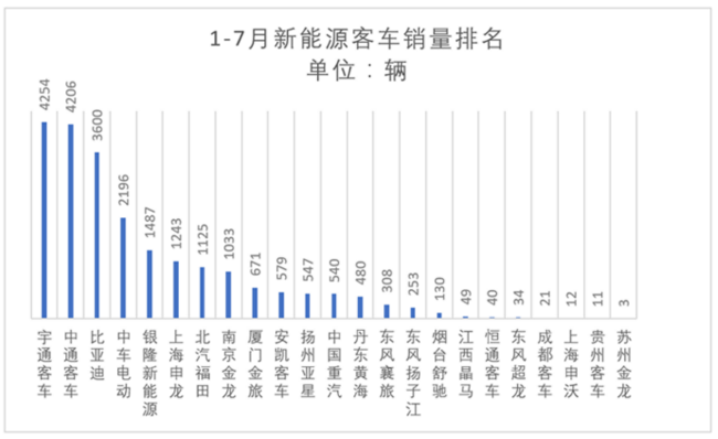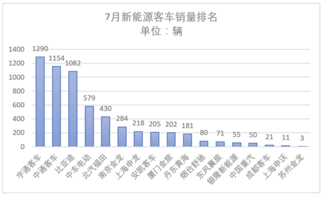 7月5916輛的新能源客車銷量,主要集中在17家企業(yè)。其中,3家企業(yè)銷量過千,分別為宇通(1290輛)、中通(1154輛)和比亞迪(1082輛)。