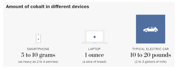 其實這種有色金屬早已在各種現(xiàn)代電子設備當中廣泛使用,每臺智能手機當中都包含5到10克鈷,而筆記本電腦當中的鈷含量則達到1盎司。不過電動汽車確實導致了市場需求的飆升:每臺新能源汽車,都要消耗10到20鎊鈷,遠遠超過電子移動設備的制造需求。