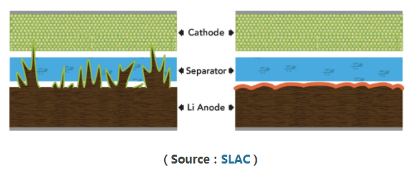 鋰離子電池跟一般電池一樣,是由陽(yáng)極(Anode)、陰極(cathode)及電解液組成,發(fā)電則是靠鋰離子穿梭于陽(yáng)極陰極之間,樹(shù)枝狀結(jié)晶(dendrite)是一個(gè)發(fā)生在陽(yáng)極且是造成鋰離子電池短路的主因之一,當(dāng)充電放電次數(shù)越多時(shí),電極和電解質(zhì)之間會(huì)形成像樹(shù)枝狀的界面 SEI(solid-electrolyte interphase),界面升長(zhǎng)觸碰到對(duì)面的陰極時(shí)就會(huì)發(fā)生短路,由于電解液時(shí)常是可燃物,因此甚至進(jìn)一步會(huì)引發(fā)著火,雖然后來(lái)科學(xué)家有改成使用石墨當(dāng)作陽(yáng)極來(lái)避免此問(wèn)題,但是石墨電極的效率并不及金屬電極。