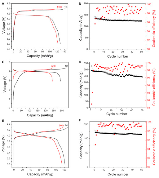 圖4-不同4.0V水基鋰電池的充放電電壓/循環(huán)性能