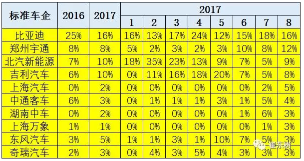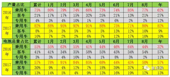 從產(chǎn)量結(jié)構(gòu)的變化看,17年8月的客車(chē)用電池占比38%,較16年全年的54%下降較大。但8月的客車(chē)占比達(dá)到38%,算是恢復(fù)的較好。乘用車(chē)總體看是占產(chǎn)量需求的82%和電池需求的57%,仍是引領(lǐng)消費(fèi)增長(zhǎng)的核心動(dòng)力。但8月體現(xiàn)的客車(chē)恢復(fù)較好。