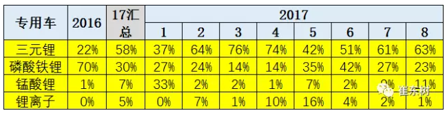專用車(chē)的三元化趨勢(shì)很明顯。1-8月的三元電池的裝車(chē)量達(dá)到58%的占比,而16年的占比是20%,提升的趨勢(shì)相對(duì)是合理的狀態(tài)。