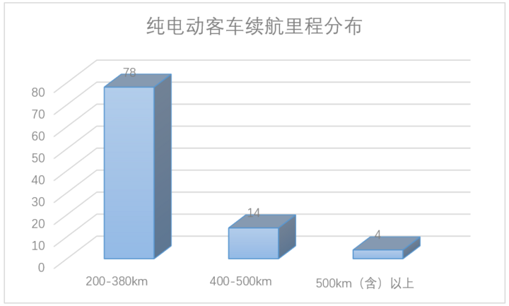 進(jìn)入第9批目錄的純電動(dòng)客車(chē)?yán)m(xù)航里程集中分布在200-380km之間,共計(jì)78款,占比總量78%;400-500km之間的車(chē)型14款,500km(含)以上的車(chē)型4款,續(xù)航里程最高的車(chē)型為山東沂星電動(dòng)汽車(chē)有限公司的飛燕牌純電動(dòng)城市客車(chē),續(xù)航里程達(dá)到550km。