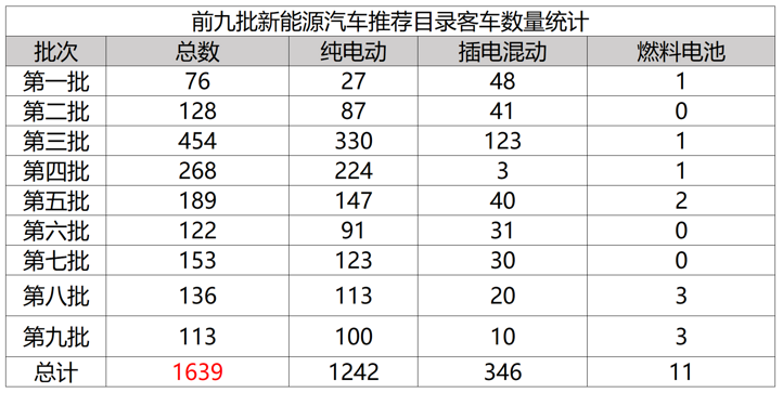 9月30日,工信部發(fā)布《新能源汽車(chē)推廣應(yīng)用推薦車(chē)型目錄(2017年第9批)》,共包括95戶企業(yè)的251個(gè)車(chē)型。新能源客車(chē)方面,共有39戶企業(yè)113款車(chē)型入選。其中,純電動(dòng)客車(chē)100款,插電式混合動(dòng)力客車(chē)10款,燃料電池客車(chē)3款。截止目前,工信部發(fā)布的9批目錄中,共計(jì)1639款新能源客車(chē)進(jìn)入。