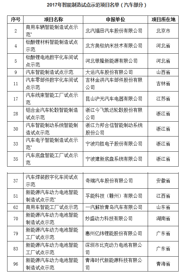 10月16日,工信部發(fā)布2017年智能制造試點(diǎn)示范項(xiàng)目名單,包括17項(xiàng)汽車項(xiàng)目,其中5個(gè)新能源汽車動(dòng)力電池智能工廠試點(diǎn)示范項(xiàng)目,2個(gè)鈦酸鋰材料智能制造試點(diǎn)示范項(xiàng)目。