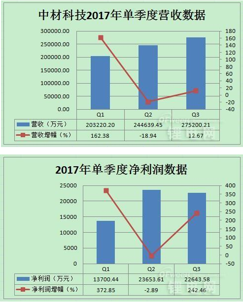 以今年單季的業(yè)績數(shù)據(jù)來看,2017年中材科技一季度的營收和凈利潤增幅最大,分別實(shí)現(xiàn)了162.38%、372.85%的增長,主要是因?yàn)?016年投資項(xiàng)目實(shí)現(xiàn)營收。二季度有小幅的下滑后,到三季度業(yè)績再度實(shí)現(xiàn)增長。