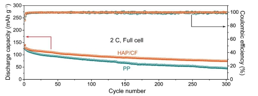 采用新型羥基磷灰石超長納米線基耐高溫電池隔膜組裝的全電池具有更高的比容量和更穩(wěn)定的循環(huán)性能