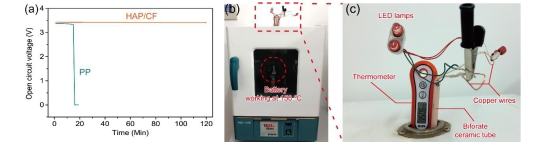 采用新型羥基磷灰石超長納米線基耐高溫電池隔膜組裝的電池在150℃高溫環(huán)境中能夠保持正常工作狀態(tài)并點(diǎn)亮小燈泡
