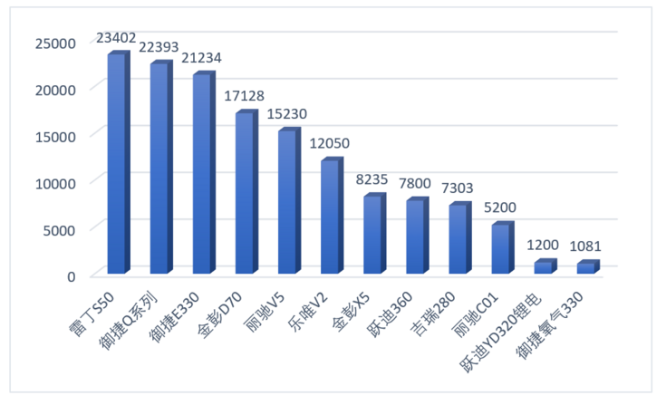 市場(chǎng)良好表現(xiàn)的背后是受認(rèn)可產(chǎn)品的熱銷(xiāo)。根據(jù)第一電動(dòng)研究院統(tǒng)計(jì),多款市場(chǎng)熱銷(xiāo)車(chē)型1-10月累計(jì)銷(xiāo)量過(guò)萬(wàn),其中雷丁S50以1-10月累計(jì)銷(xiāo)售23402輛成為低速電動(dòng)車(chē)市場(chǎng)的單品車(chē)型銷(xiāo)量冠軍,由于本文并未呈現(xiàn)全部車(chē)型數(shù)據(jù),因此不對(duì)單車(chē)型的銷(xiāo)量做排名統(tǒng)計(jì),不過(guò)御捷Q系列和御捷E330-10月的累計(jì)銷(xiāo)量分別為22393輛和21234輛緊隨其后,車(chē)型銷(xiāo)量冠亞軍分別為雷丁S50、御捷Q系列和御捷E330。