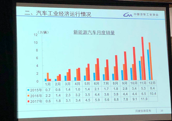 中汽協(xié)秘書長助理陳士華表示,根據(jù)今年月度產(chǎn)銷走勢看,1-12月新能源汽車?yán)塾嬩N量或接近80萬輛,和年初預(yù)計差距不大。此外,中汽協(xié)秘書長助理許海東預(yù)計2018年的新能源汽車產(chǎn)銷或達(dá)100萬輛。