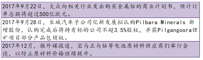 第二股力量是新能源汽車企業(yè)??紤]到未來新能源汽車產(chǎn)業(yè)的發(fā)展,車企也加入到鈷、鋰資源“搶奪”隊(duì)伍之中,以求為企業(yè)未來發(fā)展儲備上游原材料,試圖參與到鈷、鋰資源的議價(jià)體系之中,來保證企業(yè)未來發(fā)展的主動權(quán)。