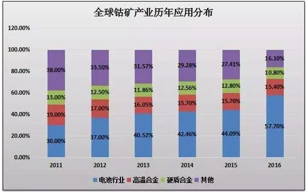 據(jù)相關(guān)調(diào)研機(jī)構(gòu)統(tǒng)計(jì)資料顯示,2016年我國鈷消費(fèi)量約為4.58萬噸,同比增加3.78%,其中電池材料消費(fèi)量約為3.66萬噸,占鈷整體消費(fèi)結(jié)構(gòu)的78%。目前三元電池憑借較高的比能量受到了市場的青睞,鈷需求量暴增,供需缺口被越扯越大。有機(jī)構(gòu)預(yù)測2016-2018年,鈷在冶金領(lǐng)域?qū)⒊霈F(xiàn)每年1000-3000噸缺口。而根據(jù)機(jī)構(gòu)調(diào)研資料,包括嘉能可、洛陽鉬業(yè)、歐亞資源在內(nèi)的鈷供應(yīng)商,短期內(nèi)沒有過多產(chǎn)能提升。