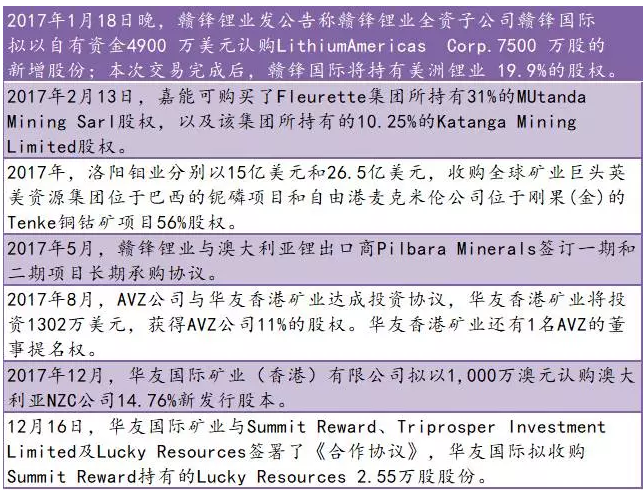 鋰資源方面國外的SQM、FMC等,國內(nèi)的天齊鋰業(yè)、贛鋒鋰業(yè)等都是這方面力量的代表;在鈷方面有數(shù)據(jù)顯示,采礦業(yè)巨頭嘉能可、洛陽鉬業(yè)、歐亞資源和金川集團(tuán)目前占據(jù)了全球60%的鈷產(chǎn)量。通過資本的兼并購,礦業(yè)巨頭們進(jìn)一步提升了對全球鋰鈷資源的控制權(quán),在鈷鋰資源量價(jià)齊升的當(dāng)下,牢牢把握市場主動權(quán),從而保證企業(yè)盈利。