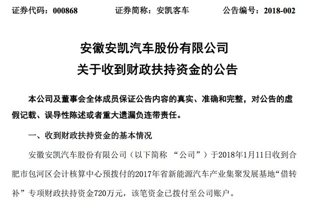 1月11日,安徽安凱汽車股份有限公司(安凱客車 000868)發(fā)布公告表示,公司于2018年1月11日收到合肥市包河區(qū)會(huì)計(jì)核算中心預(yù)撥付的2017年省新能源汽車產(chǎn)業(yè)集聚發(fā)展基地“借轉(zhuǎn)補(bǔ)”專項(xiàng)財(cái)政扶持資金720萬(wàn)元,該筆資金已撥付至公司賬戶。