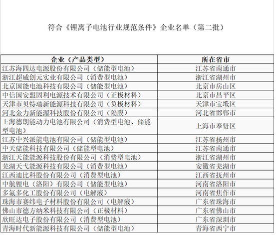 2018年1月15日,國(guó)家工信部公布了符合《鋰離子電池行業(yè)規(guī)范條件》企業(yè)名單(第二批),海四達(dá)、超威創(chuàng)元、國(guó)能、中信國(guó)安盟固利、貝特瑞、中航鋰電、欣旺達(dá)、德朗能、中天儲(chǔ)能、蕪湖天弋等18家企業(yè)正式入選。
