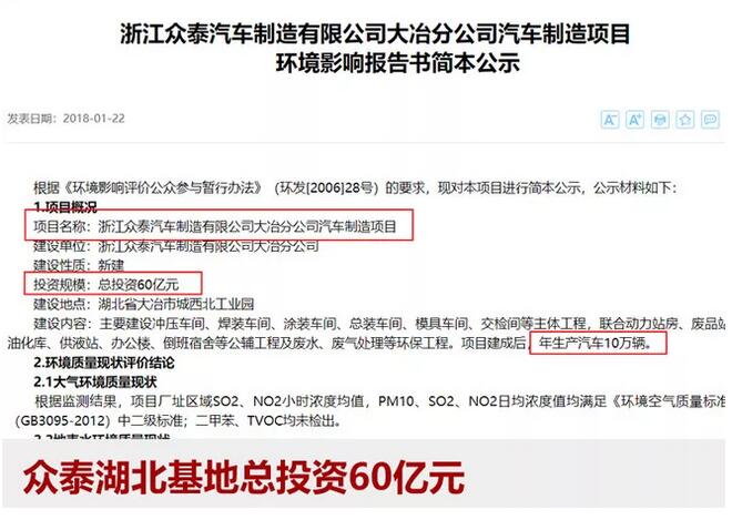 根據(jù)環(huán)評信息顯示:浙江眾泰汽車制造有限公司大冶分公司汽車制造項(xiàng)目總投資60億元,主要建設(shè)沖壓車間、焊裝車間、涂裝車間、總裝車間、模具車間、交檢間等主體工程,聯(lián)合動力站房、廢品站、油化庫、供液站、辦公樓、倒班宿舍等公輔工程及廢水、廢氣處理等環(huán)保工程。項(xiàng)目建成后,年生產(chǎn)汽車10萬輛。