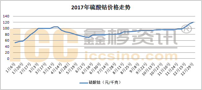 而對(duì)于鈷供應(yīng)市場(chǎng)的過(guò)度敏感也使得2017年MB鈷價(jià)翻倍,而我國(guó)鈷價(jià)漲幅也快翻了一倍。2017年12月末鋰電池正極材料用硫酸鈷均價(jià)已漲至11.7萬(wàn)元/噸,較2017年初均價(jià)4.7萬(wàn)元/噸上漲149%,而從全年的價(jià)格走勢(shì)來(lái)看,6月份價(jià)格回落后持穩(wěn)了兩個(gè)月就隨著動(dòng)力電池旺季到來(lái),硫酸鈷價(jià)格再次一路上漲。