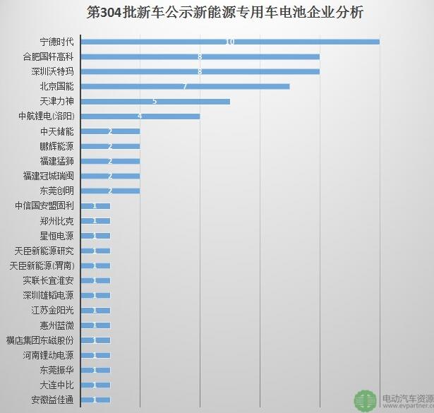 在第304批新車公示中,有26家電池企業(yè)為66款新能源專用車及其底盤提供配套。其中寧德時(shí)代、桑頓、合肥國(guó)軒高科、深圳沃特瑪、北京國(guó)能所配套的車型數(shù)量排名靠前。以下是電池企業(yè)配套車型數(shù)據(jù)表: