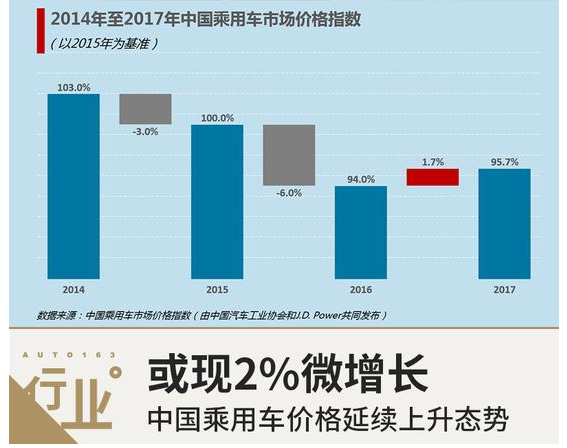 據(jù)“中國(guó)乘用車市場(chǎng)價(jià)格指數(shù)”顯示,2017年,中國(guó)乘用車市場(chǎng)價(jià)格有所回暖,比2016年微增1.7%,上升態(tài)勢(shì)有望在2018年繼續(xù)保持,預(yù)計(jì)實(shí)現(xiàn)2%增長(zhǎng)。